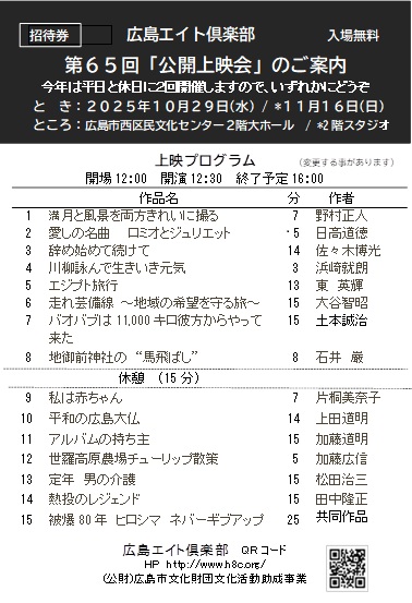 New! 第65回「公開上映会」開催 10月29日(水)、11月16日(日)の2回、広島市西区民文化センターで開催される
