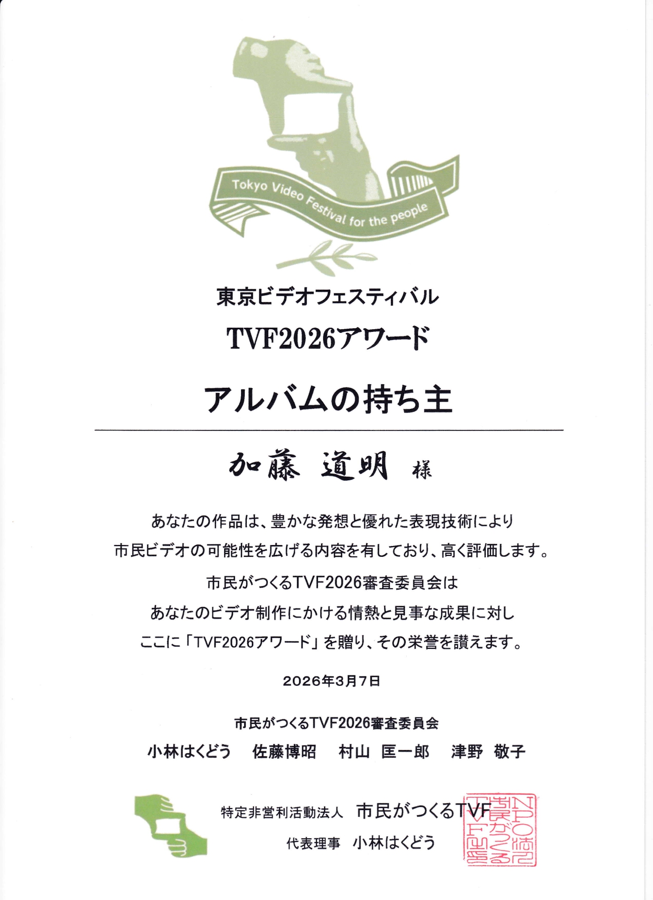 東京都内で開催された”市民による市民のための映画祭”「東京ビデオフェスティバル2026」で加藤道明さん制作した「アルバムの持主」が「TVF2026アワード」として選ばれました。これで加藤さんは3度目の受賞となります。